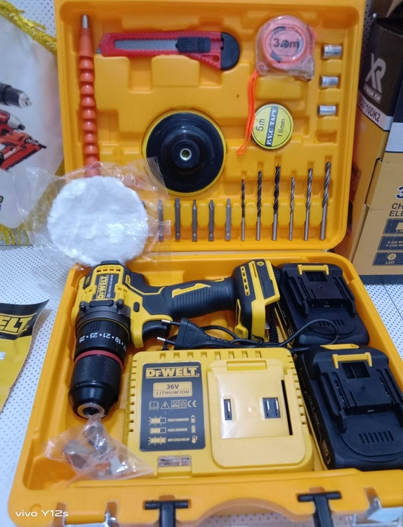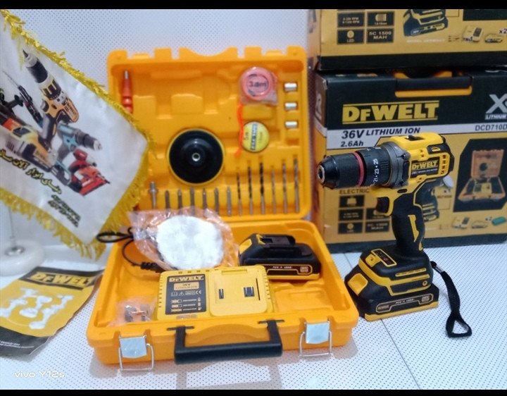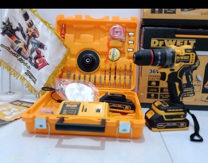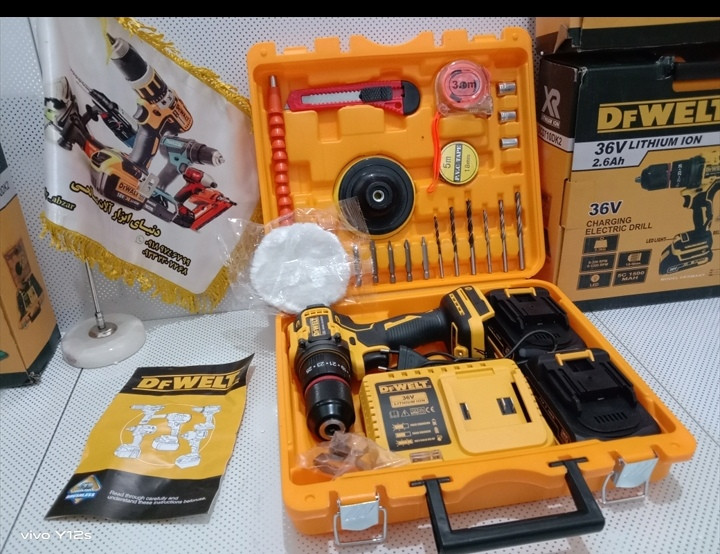 دریل شارژی دیوالت 36 ولت همراه با لوازم جانبی متنوعی ارائه میشود که شامل جعبه بی ام سی، متههای دیوار و چوب، نوکهای پیچ بند، بکسهای ریز، فنر پیچ بند، کاتر، متر، چسپ، مبدل پولیش و پد پولیش، شارژر صنعتی و دو عدد باتری میباشد. با این لوازم جانبی، میتوانید برای انجام انواع کارها و پروژههای مختلف از این دریل شارژی با کیفیت بالا استفاده کنید