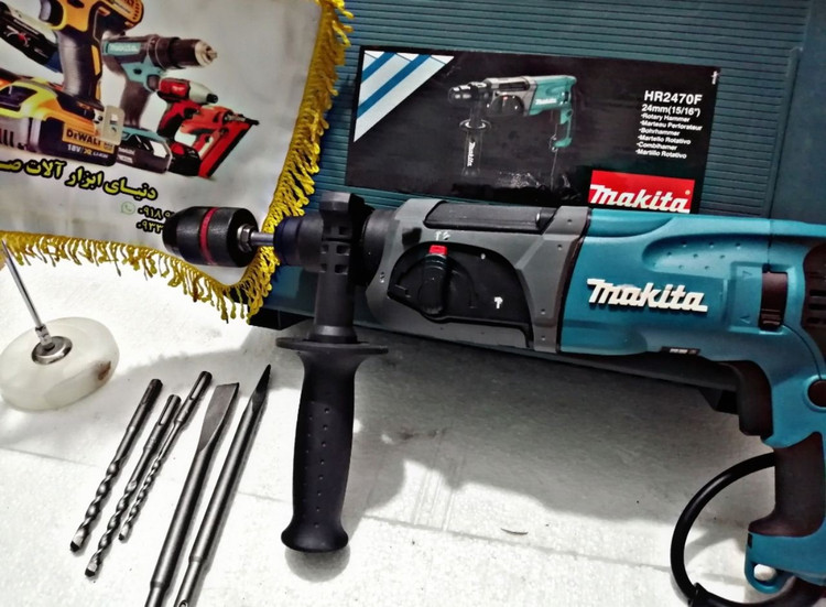 دریل بتن کن ۴ شیار ۳ کیلویی ماکیتا مدل HR2470T قدرت 780 وات دارای انرژی ضربه ای 2/7 ژول دارای سیستم تغییر وضعیت 3حالته دارای سه نظام اظافی جهت کار بر روی فلز ظرفیت مته کاری در فلز 13 میلی متر ظرفیت مته کاری در بتن 24 میلی متر تعداد ضربه 4500 – 0 در دقیقه سرعت 1100 – 0 دور در دقیقه این بتن کن مجهز به سیستم کنترل استارت،کنترل سرعت و کلاچ ایمنی می باشد بتن کن HR2470T با 2/7 ژول انرژی ضربه و 780 وات قدرت مناسب جهت سوراخکاری بر روی بتن تا سایز 24 میلیمتر می باشد این بتن کن سه حالته بوده یعنی هم میتوان از آن برای مته ، قلم و همزمان هر دو را استفاده نمود اما قدرت تخریب بالایی برخوردار نمی باشد به همراه دستگاه یک عدد سه نظام فلزی مخصوص مته های ته گرد قرار داده شده است نوع کارکرد انواع قلم و مته های چهارشیار قابل نصب بر روی دستگاه می باشد این دستگاه ساخت کارخانه چین و تحت لیسانس ماکیتای ژاپن می باشد